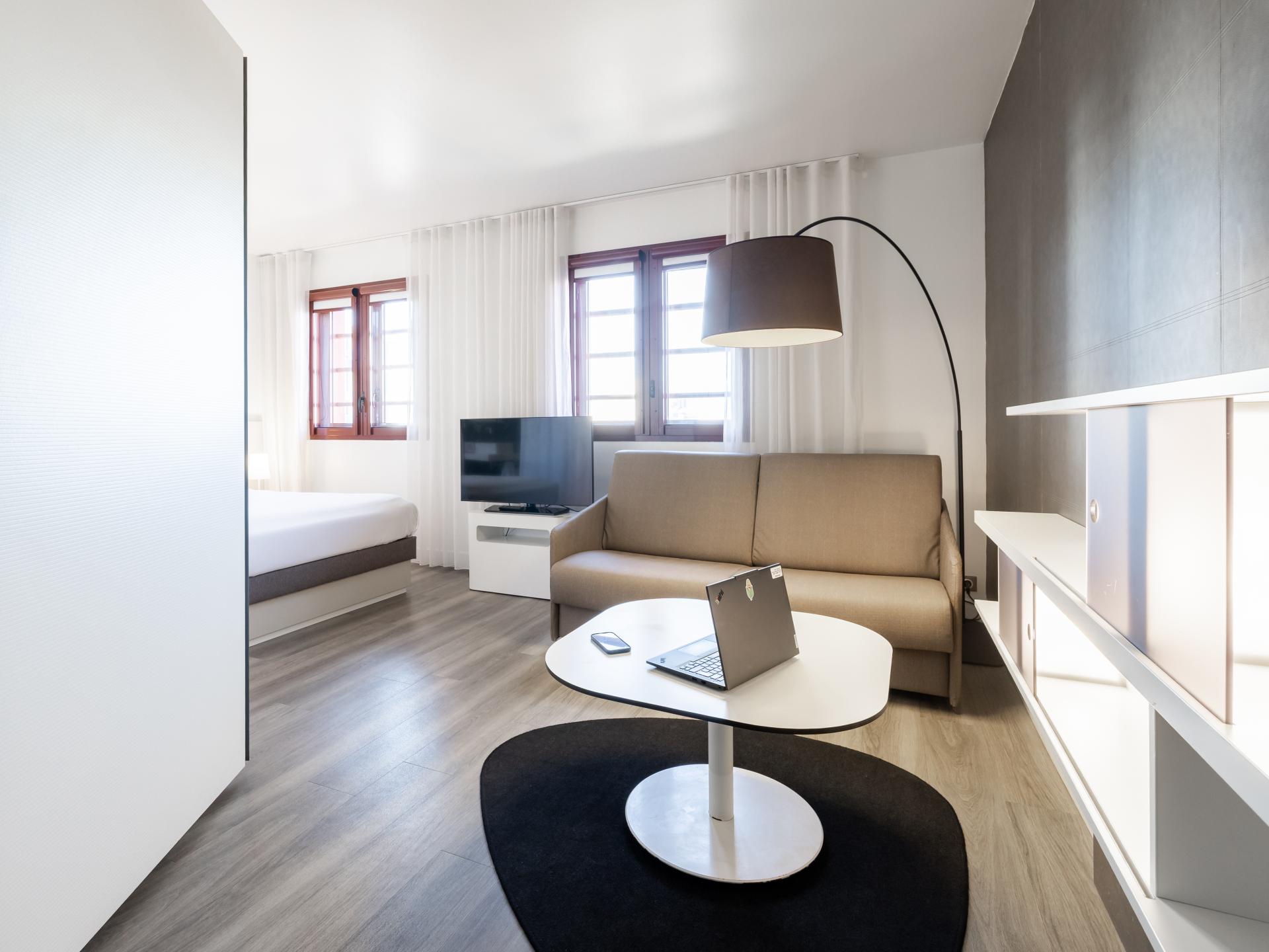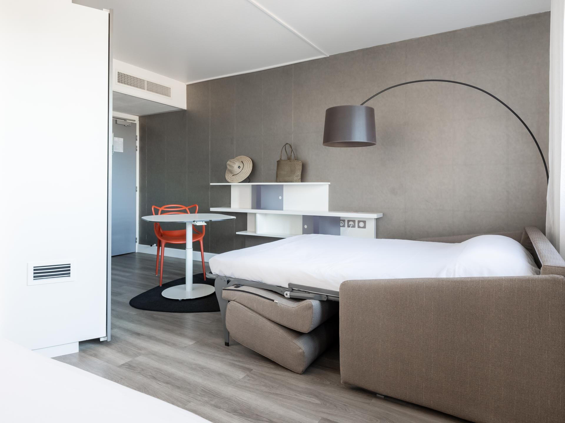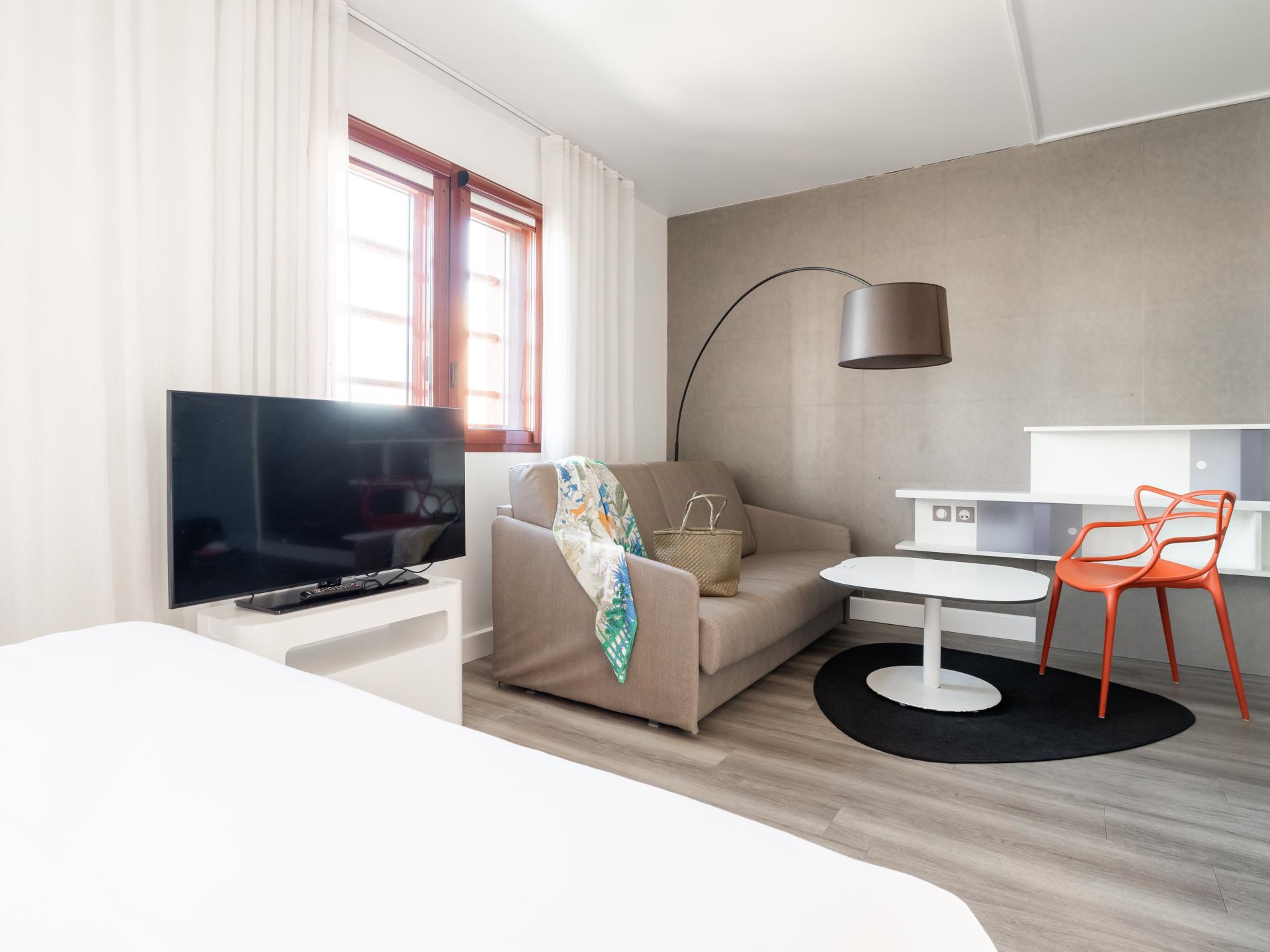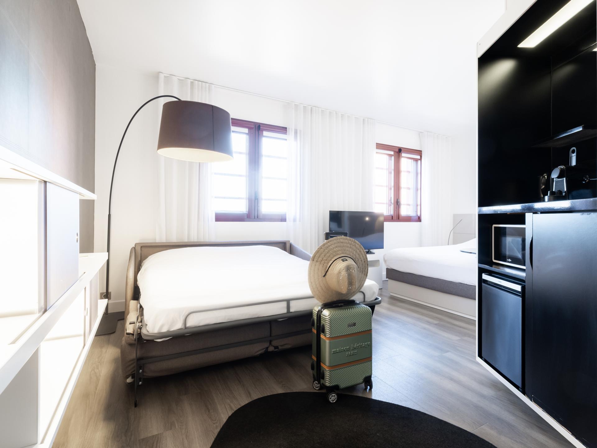 L'hôtel vous propose des suites climatisées de 30m2 tout confort pouvant accueillir jusqu'à 3 ou 4 personnes. Prenez soin de vous dans notre salle de fitness et détendez-vous au bar ou sur la terrasse. Situé en centre-ville de Perpignan, notre hôtel invite à la promenade. Partez à la découverte de la Catalogne française. Profitez-en ! Vous êtes à 15 minutes du littoral méditerranéen et de ses paysages à couper le souffle. Notre équipe dynamique et chaleureuse est là pour vous renseigner !