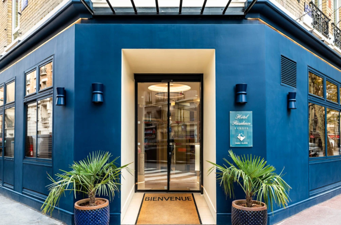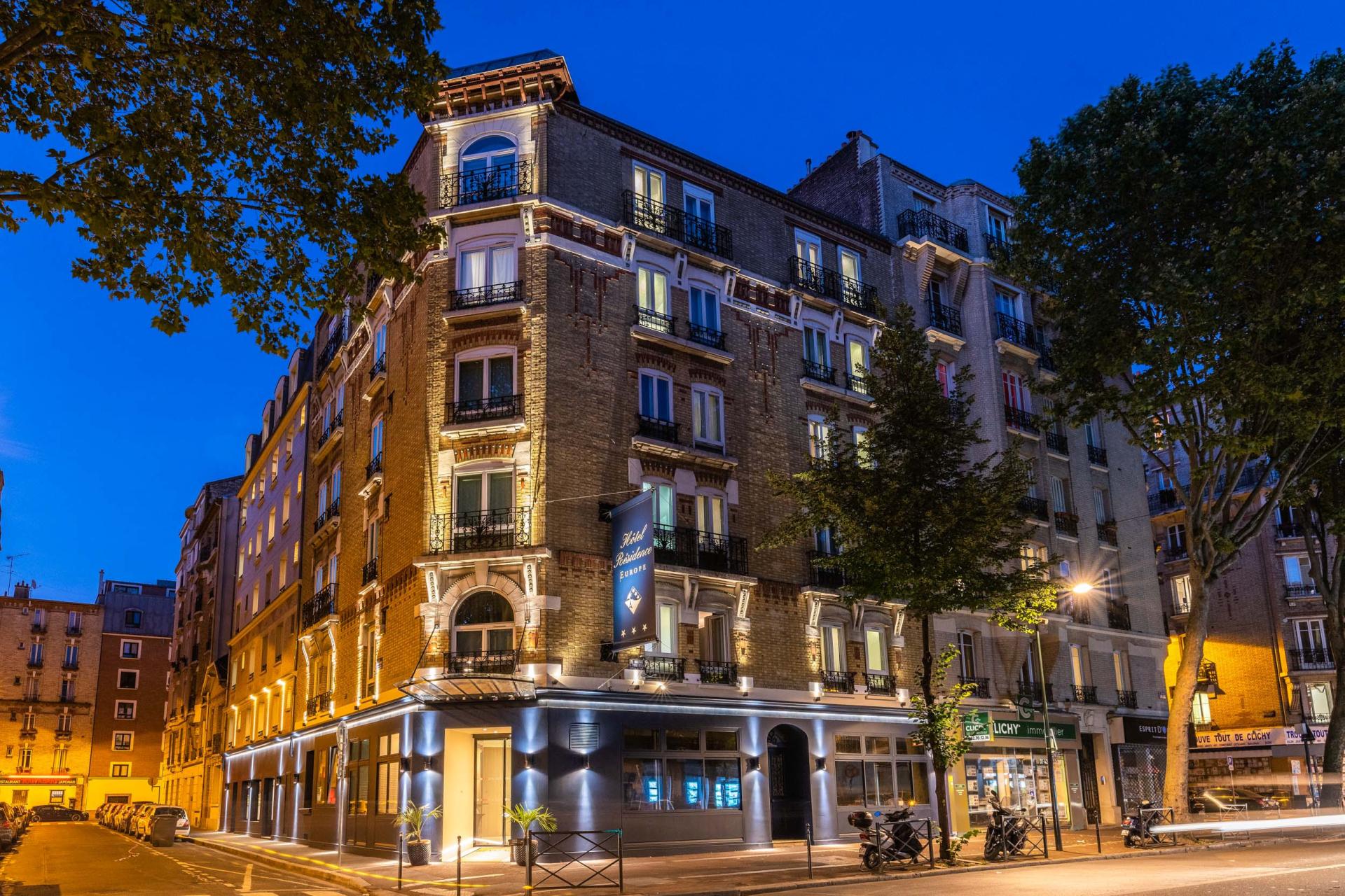 Hôtel Résidence Europe, hôtel 3 étoiles de 109 chambres situé dans le Grand Paris à Clichy. A deux pas de la ligne 14 (station Saint-Ouen) et de la nouvelle Cité Judiciaire, laissez vous charmer par cet hôtel élégant, chaleureux et contemporain à la fois. Dans une atmosphère conviviale et apaisante, vous pourrez profiter d'un bar, confortablement installé dans les fauteuils en velours d’un bleu profond ou d’un vert émeraude, de la chaleur des revêtements en chêne naturel et de l’éclairage diffus des lustres Le Deun. Des aménagements uniques sont prévus pour votre bien être, une piscine intérieure chauffée, un jacuzzi, un espace fitness, un sauna et une cabine de soins dédiée aux massages.